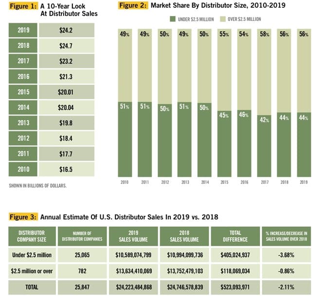 For large distributors, the average decline wasn’t as severe. Distributors in the $2.5 million-plus bracket recorded sales of $13.6 billion, showing an average loss of 0.86 percent over 2018 (see Figure 3).