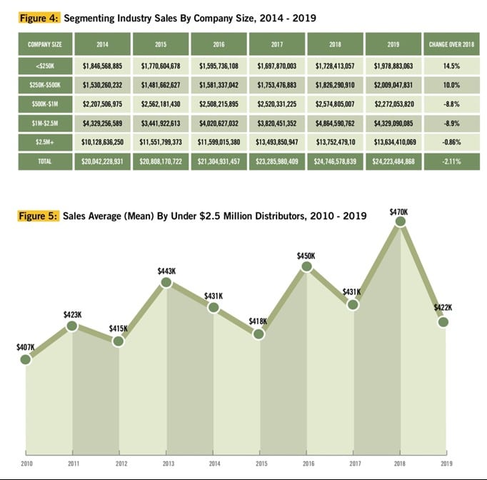 Overall, the decrease was driven by declining sales from small distributors (companies with annual sales under $2.5 million). This group experienced a 3.68-percent decrease in 2019 over 2018, while sales for larger distributors dropped only 0.86 percent. Within this group, companies with sales between $500,000 and $1 million declined 11.8 percent and those with sales between $1 million and $2.5 million declined 11 percent. However, there was some growth in this segment. Small distributors with sales up to $250,000 experienced the highest growth (14.5 percent), followed by those with sales between $250,000 and $500,000, which saw a 10-percent growth. But the growth in these smaller tiers wasn’t enough to offset the losses in the higher tiers, resulting in an average decline of 3.68 percent for the small distributor segment.