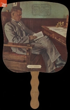 Shown above, Booker T. Washington is depicted on this cardboard handheld fan for the Jacob Brothers Funeral Home, Indianapolis, Indiana, circa 1955. As advertised on the back, the funeral home promised air-conditioning and an organ.