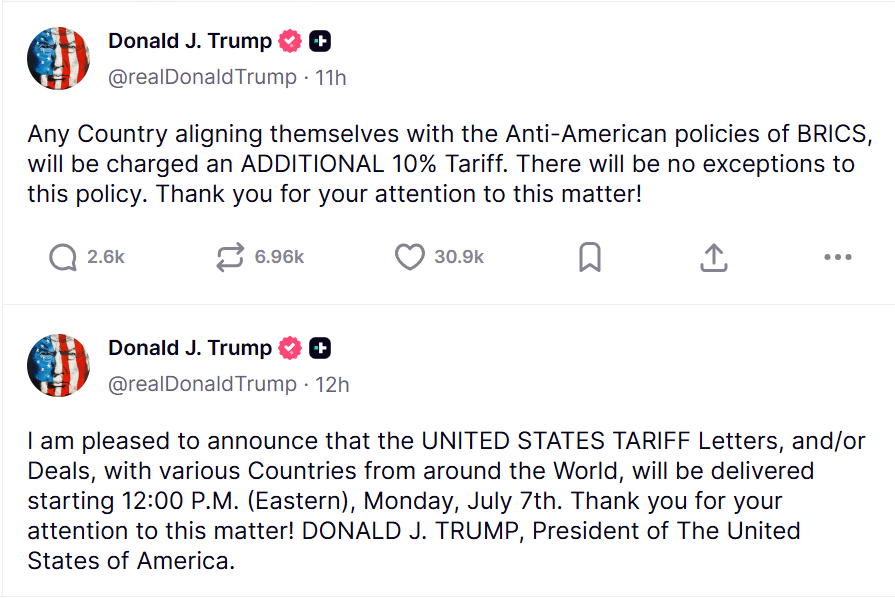 In a separate post on Truth Social, Trump declared that countries “aligning themselves with the Anti-American policies” of the BRICS developing nations will be charged an extra 10% tariff, with no exceptions to be granted.
