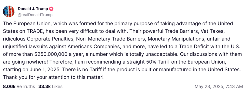 President Donald Trump kicked off Memorial Day weekend by threatening to implement a 50% tariff on imports from the European Union.