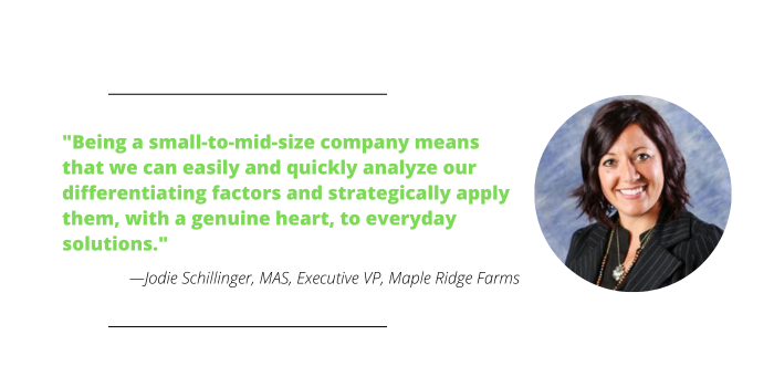 “Being a small-to-mid-size company means that we can easily and quickly analyze our differentiating factors – as an employer and as a trusted supplier partner – and strategically apply them with a genuine heart, to everyday solutions,” says Jodie Schillinger, CAS, executive vice president at Maple Ridge Farms.