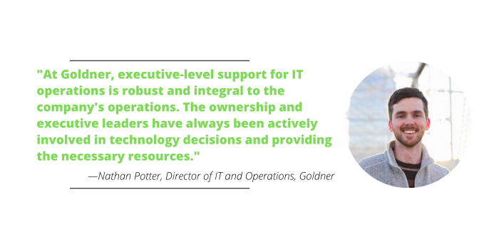 “At Goldner, executive-level support for IT operations is robust and integral to the company’s operations,” Potter says. “The ownership and executive leaders have always been actively involved in technology decisions and providing the necessary resources to accomplish our objectives.”