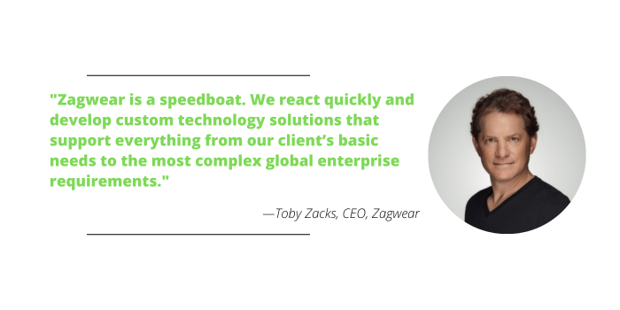 “Zagwear is a speedboat,” Zacks says. “We react quickly and develop custom technology solutions that support everything from our client’s basic needs to the most complex global enterprise requirements.”