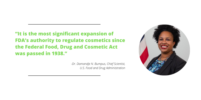 “It is the most significant expansion of FDA’s authority to regulate cosmetics since the Federal Food, Drug and Cosmetic Act was passed in 1938,” says Dr. Damandje N. Bumpus, chief scientist at the U.S. Food and Drug Administration.
