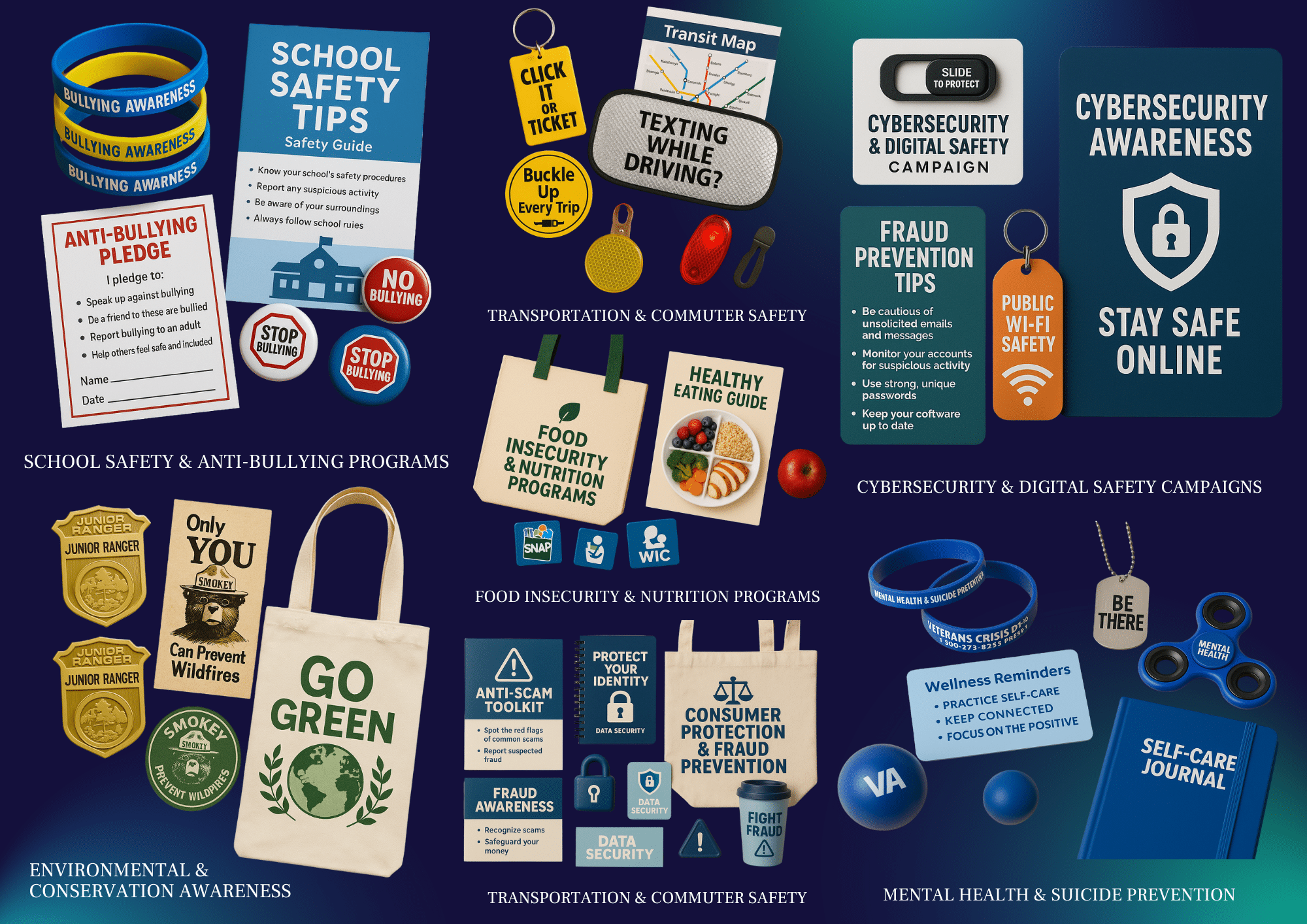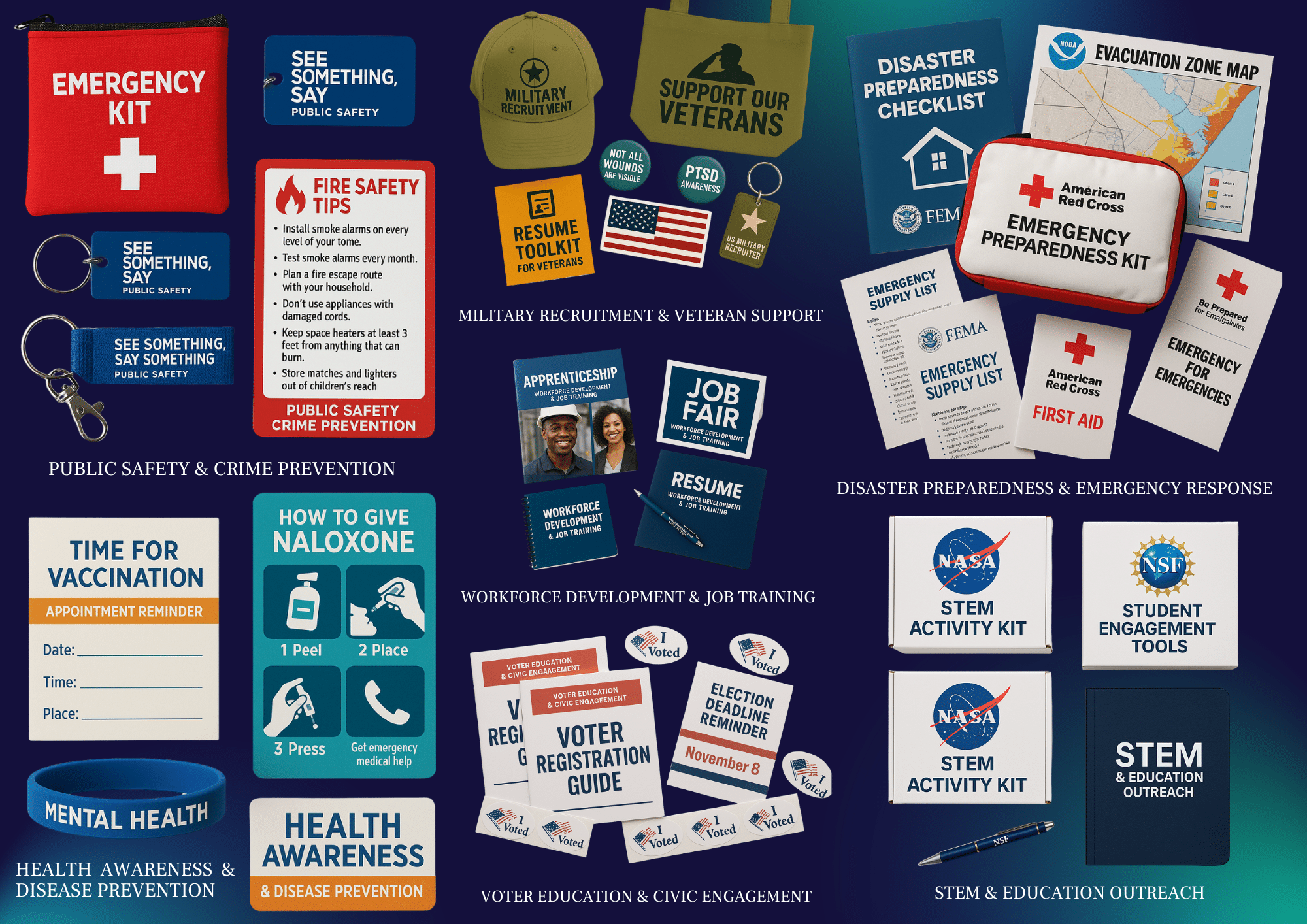 Promotional products work for government agencies, too! See real products used in campaigns to support veterans, prevent crime and more. Virtually any public messaging campaign is aided by promotional products, which has been shown by research to produce greater consumer recall than broadcast, online and mobile advertising, among other forms of the most common public service announcements.
