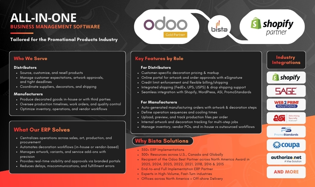 Whether you’re a supplier managing high-volume custom orders or a distributor aiming to improve fulfillment speed and accuracy, Bista delivers scalable, flexible solutions built around your actual workflows. Our goal is to help companies reduce manual work, improve communication, and operate more efficiently across the promotional product value chain.