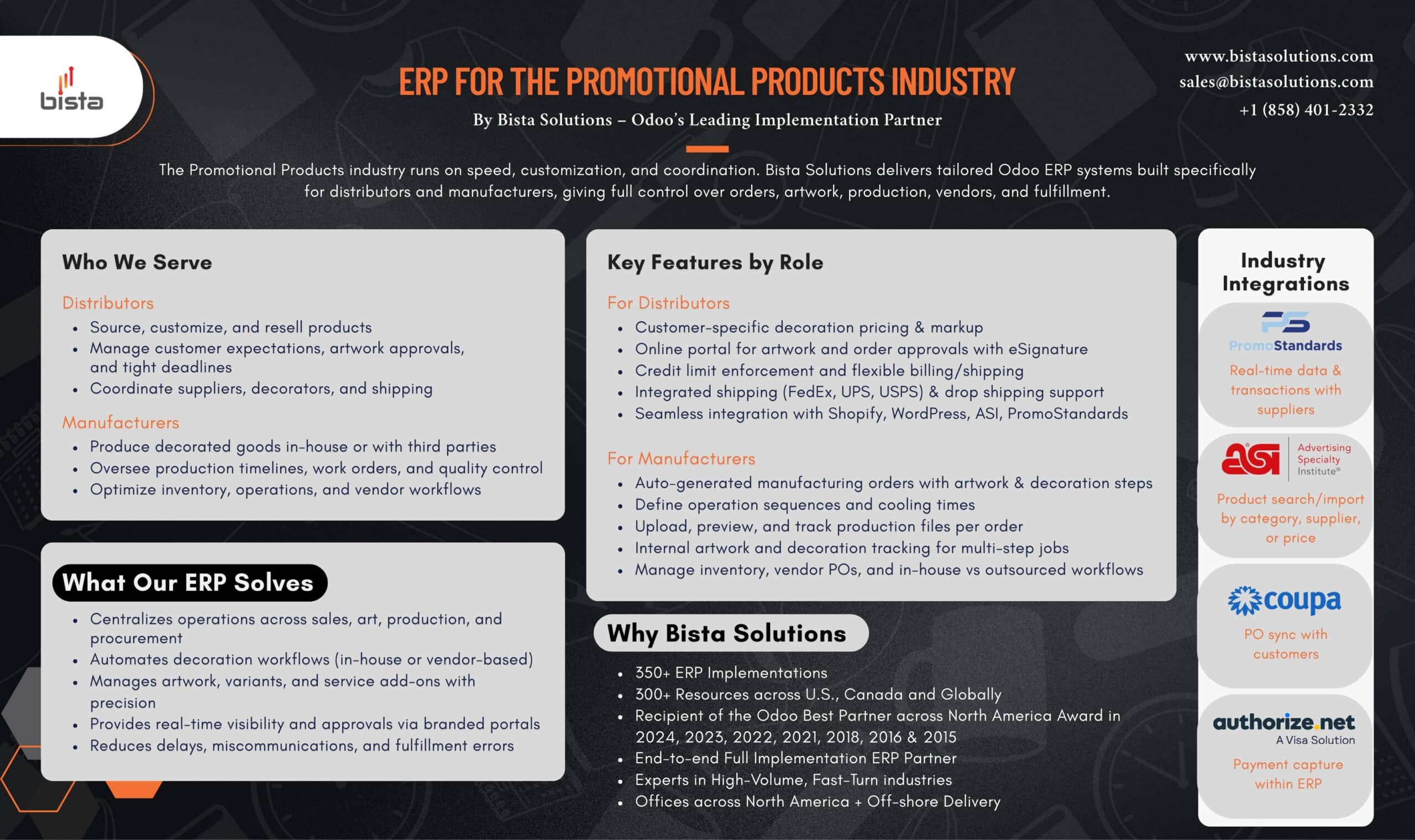 customers and vendors, split shipments, and integrations with industry standards like ASI and PromoStandards for seamless