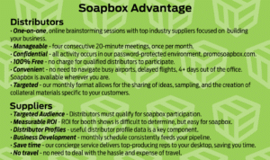 Soapbox is a fresh and innovative online meeting platform. Our concierge service facilitates private, one-on-one conversations between promo suppliers and distributors. Make connections. Enhance your network. Stay on top of trends. Build your business